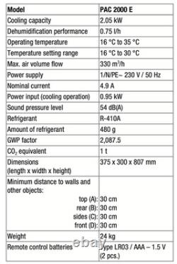 In ventilation mode the device provides the opportunity of air circulation without cooling effect. In dehumidification mode moisture is withdrawn from the air. The device operates fully automatically and features a variety of further options. The device can, for instance, be switched on or off automatically with time delay via the timer function. Operation of the device is possible either via the control panel at the device or via the supplied infrared remote control.
