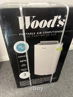 Start the cooling a couple of hours before you enter the room to be greeted by the perfect indoor temperature. Maximum cooling capacity: 9,000 Btu/h - 2.6 kW. Low Energy Consumption Class A+. Works in temperatures up to 43°C. Suitable for rooms 62.4m³. 3 fan speed to select the maximum power or the minimum noise. Air flow up to 320 m³/hr. H 85 x W 47.1 x D 35.5cm.What's in the box? Wood's Cortina 9K BTU Portable Air conditioning unit. Note: Please wait at least an hour, after leaving in an upright position, before starting the Air Conditioner for the first time. Slight box damage but contents are fine.